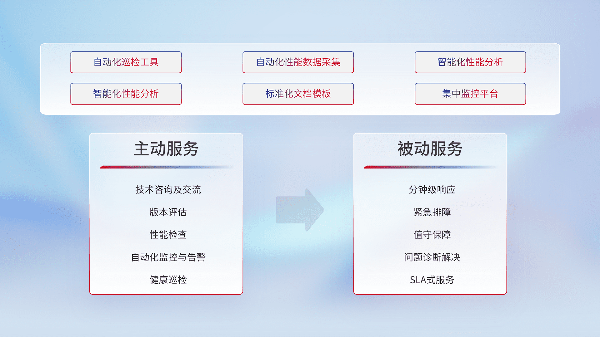 智能化工具和标准化文档,,,保障服务质量,,,提供主动服务(包含技术咨询、、、、版本评估、、、、性能检查、、、、自动化监控与告警、、健康巡检)和被动服务包含(分钟级响应、、紧急排障、、值守保障、、、问题诊断解决、、、、SLA服务)。。。。